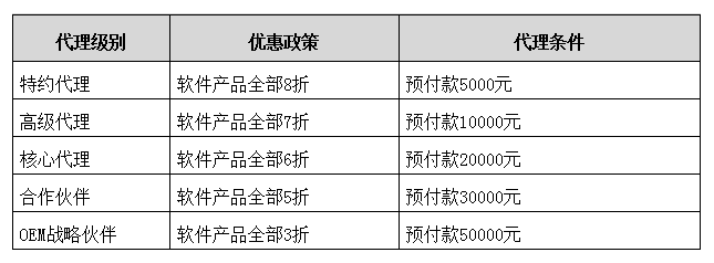 3、代理分為以下級別,代理級別和優(yōu)惠政策以及代理條件見下表: